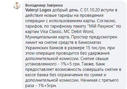 "Согласно, тарифов, по тарифному пакету "Мій Рахунок" по картам Visa Classic, MC Debit Word, Муниципальная карта, Простир предусмотрен лимит на снятие средств в банкоматах украинских банков в размере 15 тыс грн. При этом операция проводится без удержания дополнительной комиссии. Снятие свыше установленного - 1%+5 грн. Также, банк предоставляет возможность совершать снятие в кассе банка без ограничения по сумме и дополнительной комиссии. Начиная с третьего раза - 1%+5грн" - пояснил представитель банка на странице "Ощада" в Facebook.