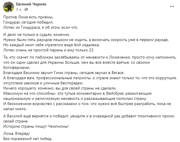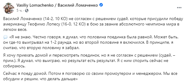 О том, что решение судей несправедливое, после поединка заявил сам Ломаченко. Это сообщение у него вышло в Фейсбуке.