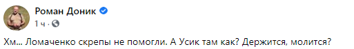 "Ломаченко скрепы не помогли. А Усик там как? Держится, молится?", - издевается волонтер Роман Доник.