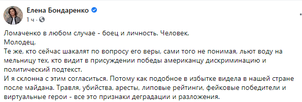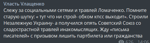"Слежу за социальными сетями и травлей Ломаченко. Помните старую шутку: "тут что ни строй - обком кпсс выходит". Строили Незалежную Украину - а получился опять Советский Союз со сладострастной травлей инакомыслящих. Жду "письма писателей" с призывом лишить партбилета или гражданства", - пишет телеведущая Наталья Влащенко.