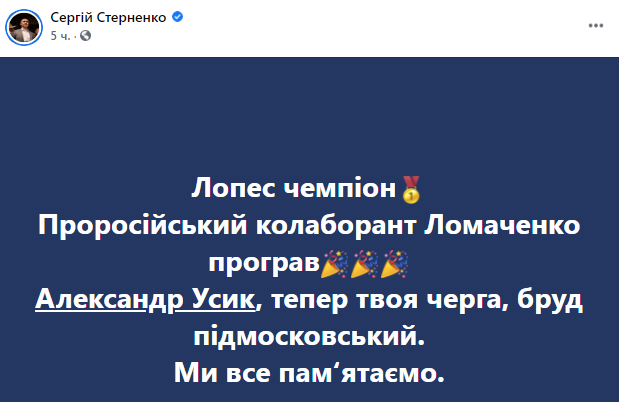 "Лопес чемпион. Пророссийский коллаборационист Ломаченко проиграл. Александр Усик, теперь твоя очередь, грязь подмосковская. Мы все помним", - написал экс-глава одесского "Правого сектора" Сергей Стерненко.