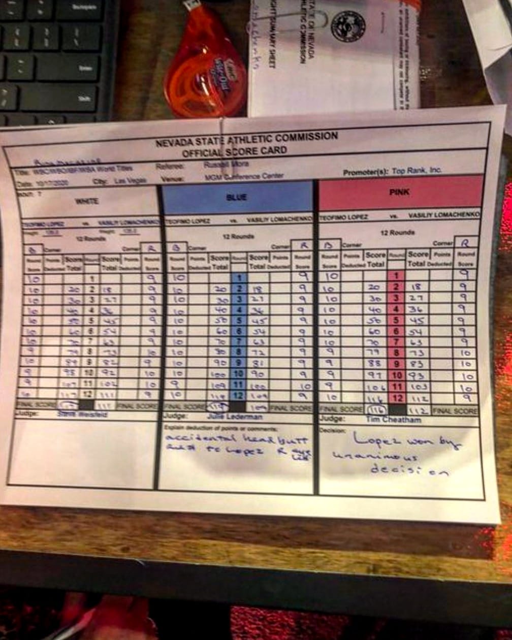 Учитывая, что бой закончился без нокаута, картина неочевидна с точки зрения победы или поражения Ломаченко. Но у американских судей все оказалось иначе: они присудили победу Лопесу, причем один из рефери посчитал, что украинец проиграл вообще все раунды.