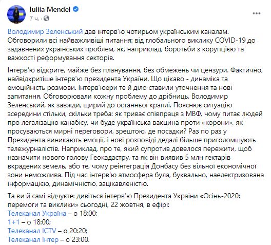 "Обсуждали каждую проблему до мелочей. Владимир Зеленский, как всегда, искренен до последней капли. Объясняет ситуацию изнутри столько, сколько надо: как идет сотрудничество с МВФ, почему спрашивает людей о легализации каннабиса, будет украинский вакцина против "короны", как продвигаются мирные переговоры, в конце концов, где посадки? Раз за разом у Президента возникают эмоции, и новые рассказы все больше поражают тележурналистов. Например, о том, какое сопротивление пришлось пережить, чтобы назначить нового главу Геокадастр, и как он обнаружил 5 млн гектаров украденных земель, или то, чем реинтеграция Донбасса без свободной экономической зоны невозможна. Во время интервью атмосфера была, буквально, наэлектризована информацией, динамичностью, заинтересованностью" - написала Юлия Мендель.