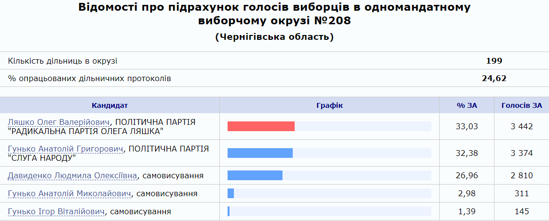 11:38  По Чернигову подсчитали 30% на довыборах в Раду. Снова лидирует "Слуга народа" Анатолий Гунько, а Олег Ляшко на втором месте.