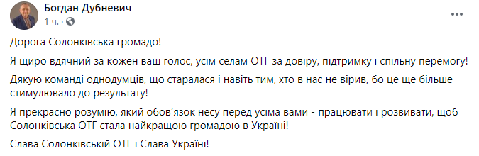 11:05  Экс-нардеп от БПП Богдан Дубневич заявил, что стал главой Солонковской тергромады на Львовщине. СМИ со ссылкой на его штаб пишут, что Дубневич набрал 51,3% голосов.