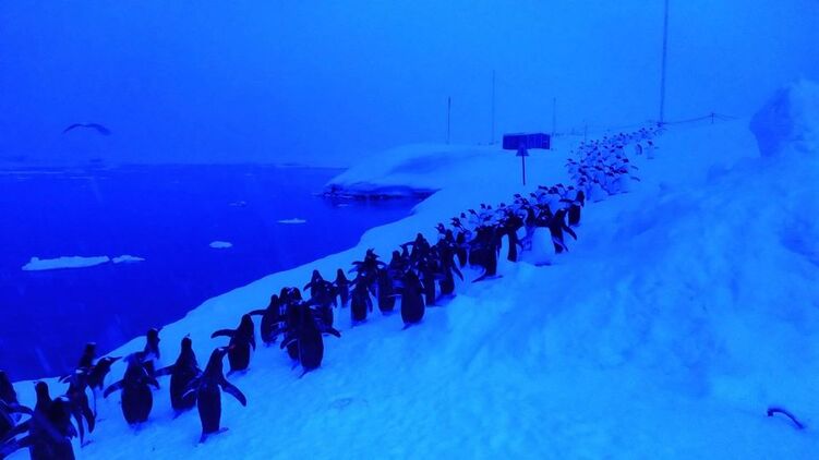 В Антарктиде в районе украинской станции Академик Вернадский пингвины выстраиваются в огромную очередь к океану, чтобы раздобыть рыбу.
