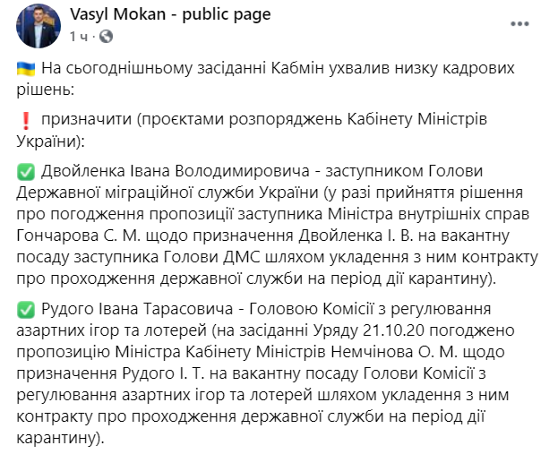 Об этом сообщил в Facebook представитель Кабинета министров в Верховной Раде Василий Мокан.