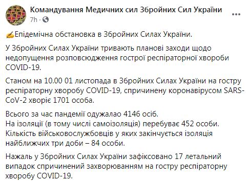 "По состоянию на 10:00 1 ноября в Вооруженных Силах Украины острой респираторной болезнью COVID-19, вызванной коронавирусом SARS-CoV-2, болеет 1 701 лицо. Всего за время эпидемии выздоровели 4 146 человек. На изоляции (в том числе самоизоляции) находятся 452 человека. Количество военнослужащих, у которых заканчивается изоляция в ближайшие трое суток, - 84 лица", - говорится в нем.