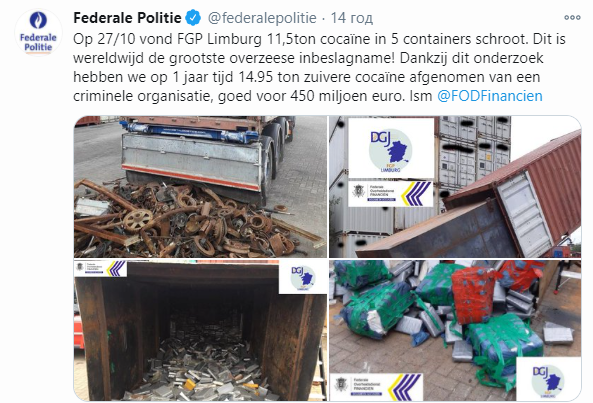 Кокаин везли в торговых контейнерах, фото: twitter.com/federalepolitie