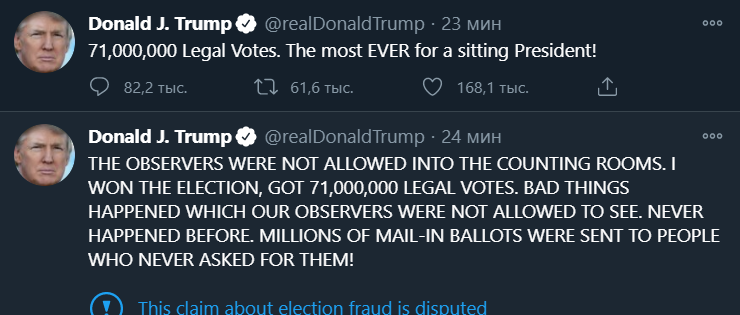 "Наблюдателей не допустили в комнаты для подсчета голосов. Я выиграл выборы, набрал 71 миллион законных голосов. Случилось много плохих вещей, которые нашим наблюдателям не позволили увидеть. Такого раньше не было. Никогда не было. Миллионы почтовых бюллетеней разослали людям, которые о них никогда не просили!", - написал президент.