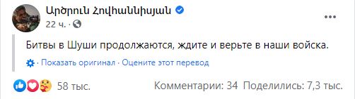 "Бои в Шуши продолжаются, ждите и верьте нашей армии", — сообщил официальный представитель Минобороны Армении Арцрун Ованнисян в Фейсбуке.