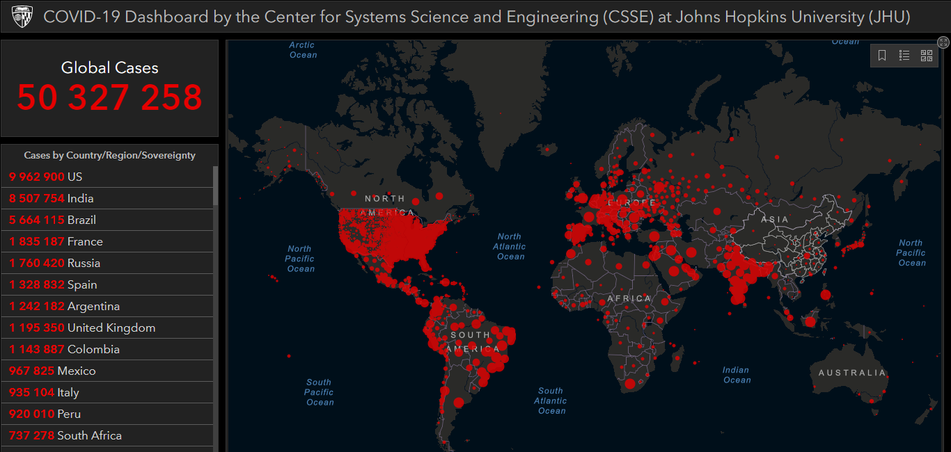Пандемия коронавируса на Земле преодолела очередной знаковый рубеж. По данным университета Дж. Хопкинса на 06.40 9 ноября (время киевское - Ред.), число зараженных на планете составило уже 50 327 258 человек, умерло 1 255 490 пациентов.