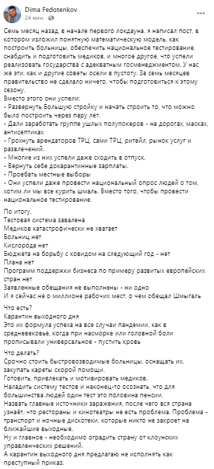 А рестораторы прямо предлагают саботировать запрет. "Карантин выходного дня предлагаю не исполнять как преступный приказ", - пишет владелец сети пиццерий Дмитрий Федотенков