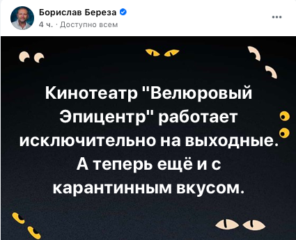 22:46 "Кинотеатр "Велюровый Эпицентр" работает исключительно на выходные. А теперь ещё и с карантинным вкусом", - написал Борислав Береза.