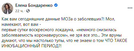 "Как вам сегодняшние данные МОЗа о заболевших?! Мол, намекают, вот вам - первые сутки воскресного локдауна, "немного снизилась заболеваемость коронавирусом", не зря все это... Эти вруны думают, что мы настолько тупы, что не знаем о том, что такое инкубационный период?", - интересуется экс-нардеп Елена Бондаренко.