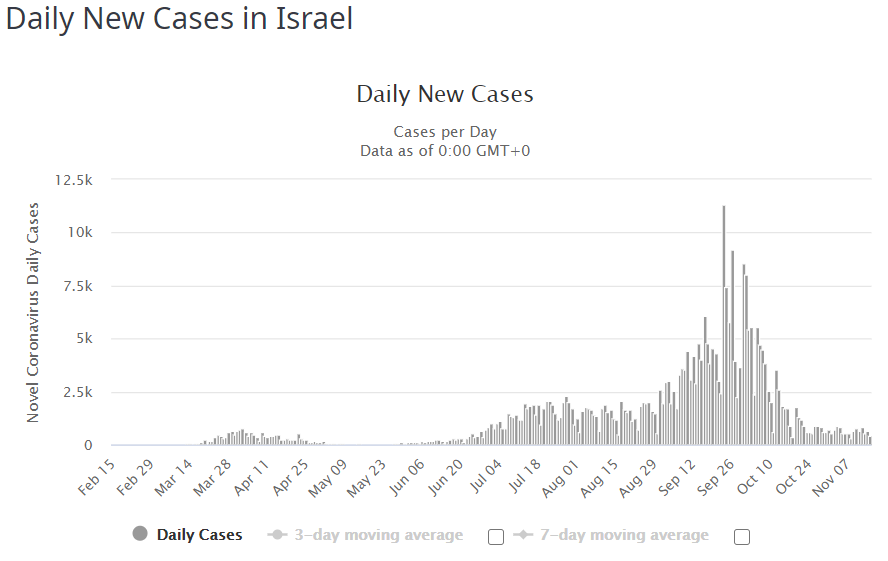 Благодаря чему к середине октября заболеваемость в Израиле пошла на спад и сейчас не превышает тысячи человек в сутки.