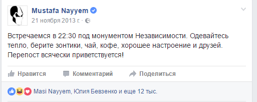 "Встречаемся в 22:30 под монументом Независимости. Одевайтесь тепло, берите зонтики, чай, кофе, хорошее настроение и друзей", – написал Найем в Facebook.