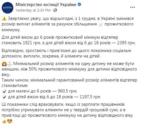 С 1 декабря в Украине изменился минимальный гарантированный размер алиментов