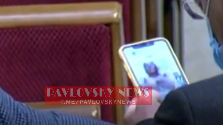 На опубликованных кадрах видно, что Евгений Петруняк сначала разговаривал по телефону, потом читал сообщения в мессенджере. Потом на экране появилось фото голой женской груди, которое, впрочем, уже через несколько секунд исчезло с дисплея смартфона. В это время рядом с ним выступал депутат от ОПЗЖ Григорий Мамка, которого и показывали во время трансляции.