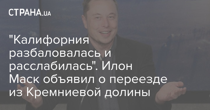 Основатель компании электромобилей Tesla Inc. и космической техники SpaceX Илон Маск переезжает из Калифорнии, где провел большую часть своей жизни, в Техас. По его мнению Калифорния "слишком расслабилась" и стала экономически не так привлекательна.