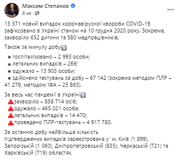 По состоянию на утро четверга, 10 декабря, количество зараженных коронавирусом в Украине увеличилось на 13 371 человека.