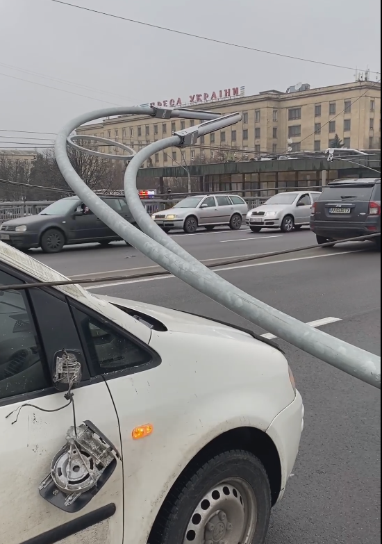 Сегодня днем автомобилисты, которые ехали по Шулявскому мосту, увидели, как один за другим падают фонарные столбы. Всего рухнуло три фонаря по одной стороне путепровода – в сторону улицы Вадима Гетьмана.