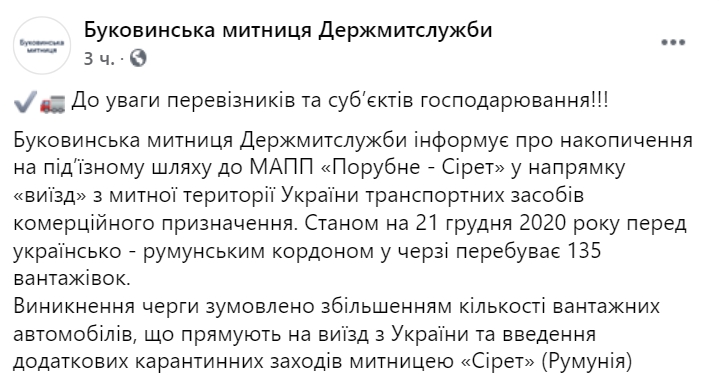 "Возникновение очереди обусловлено увеличением количества грузовых автомобилей, следующих на выезд из Украины, и введение дополнительных карантинных мероприятий таможней "Сирет" (Румыния)", - рассказали в таможне.