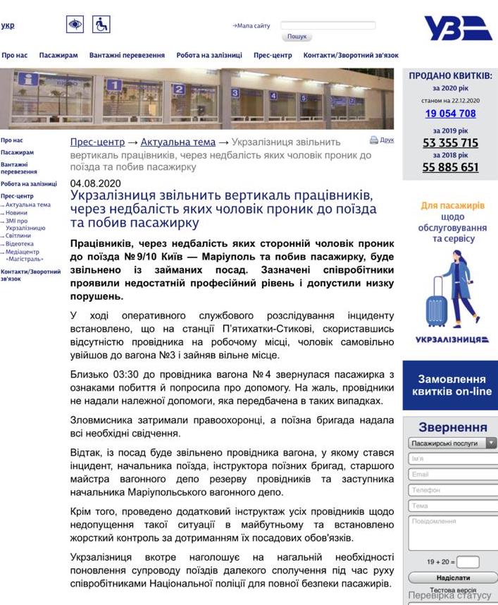 Речь идет о нападении на журналистку Анастасию Луговую в ночь на 31 июля 2020 года, когда безбилетный пассажир поезда "Мариуполь-Киев" избил девушку и пытался изнасиловать на глазах у ее сына. При этом работники поезда не оказали пострадавшей необходимую помощь, что признавали и в "Укрзализныце".