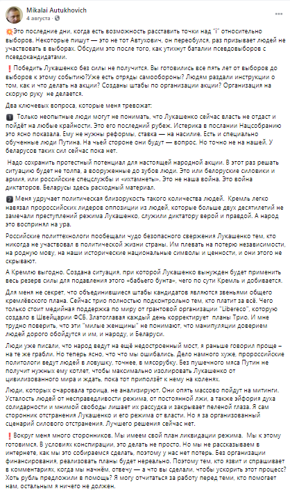"Победить Лукашенко без силы не получится", - в том же посте заявлял Автухович.