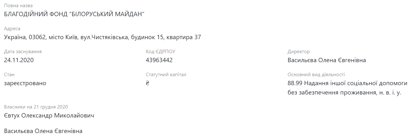 Недавно он был в Киеве и встречался с Еленой Васильевой - главой украинского благотворительного фонда "Беларускi Майдан". Судя по названию - это организация, которая поддерживает антилукашенковские протесты. Но при этом расположена она в Украине.