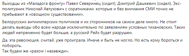 Интересно, что это сообщество считает нынешнюю белорусскую оппозицию "пророссийской" и недостаточно радикальной. И называет главной своей целью не только свержение Лукашенко, но и "разрушение русского Рейха".