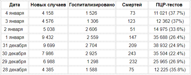Но если судить только по числу заболевших на праздники, то картина складывается позитивная. С 28 декабря по 4 января число заразившихся ни разу не превышало десяти тысяч в сутки.