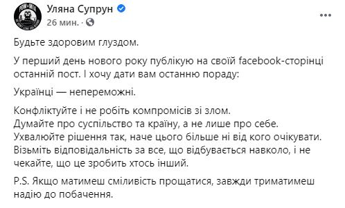 "В первый день нового года публикую на своей Фейсбук-странице последний пост. И я хочу дать вам последний совет: украинцы непобедимы. Конфликтуйте и не идите на компромисс со злом.