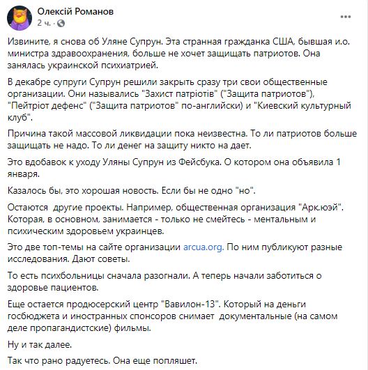 Спустя несколько дней Романов обнаружил, что в декабре Ульяна Супрун вместе с мужем закрыла три принадлежащие им общественные организации.