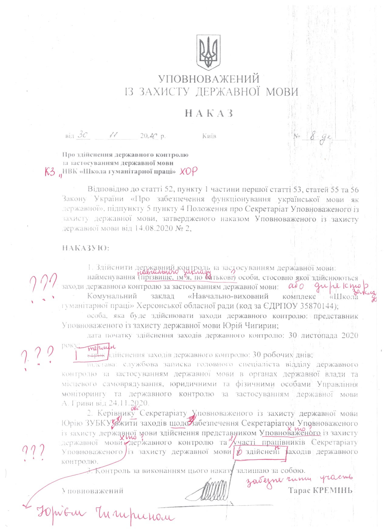 Приказ омбудсмена о проверке русскоязычной школы в Херсоне. Фото Артема Кияновского
