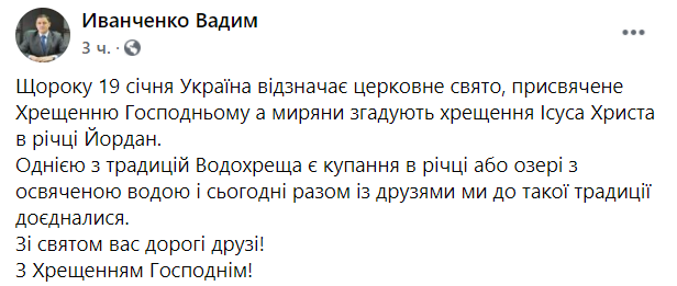 "Пусть Господь подарит вашим сердцам теплую надежду и чистые, как крещенская вода, мысли", - написал он у себя в Фейсбуке.