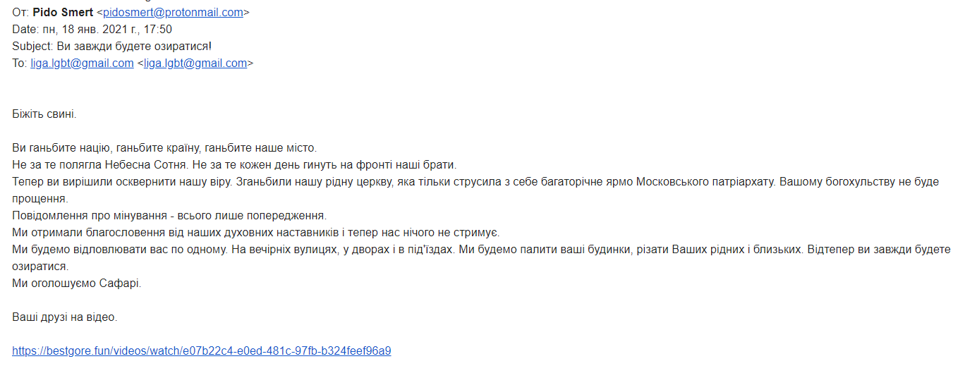 "Вы позорите нацию, позорите страну, позорите наш город. Не за то легла Небесная Сотня. Не за то каждый день гибнут на фронте наши братья. Теперь вы решили осквернить нашу веру. Опозорили нашу родную церковь, которая только стряхнула с себя многолетнее иго Московского патриархата. Вашему богохульству не будет прощения. (…) Мы получили благословение от наших духовных наставников и теперь нас ничего не сдерживает. Мы будем отлавливать вас по одному. На вечерних улицах, во дворах и в подъездах. Мы будем жечь ваши дома, резать ваших родных и близких. Теперь вы всегда будете оглядываться. Мы объявляем сафари", - сказано в письме.