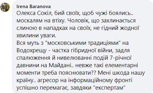 Еще одна пользовательница в комментариях уверяет, что "московские традиции на Крещение" - доля гибридной войны и нивелирование событий на Майдане 7 лет назад.
