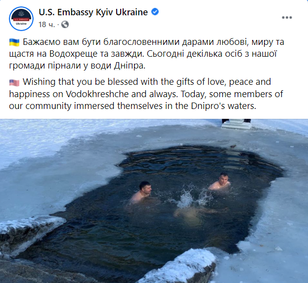 "Желаем вам быть благословенными дарами любви, мира и счастья на Крещение и всегда. Сегодня несколько человек из нашего коллектива ныряли в воды Днепра", - поделились своими эмоциями американцы.