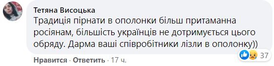 Журналистка Татьяна Высоцкая написала, что зря сотрудники посольства лезли в прорубь, потому что "традиция нырять в проруби более присуща русским, большинство украинцев не соблюдает этого обряда".