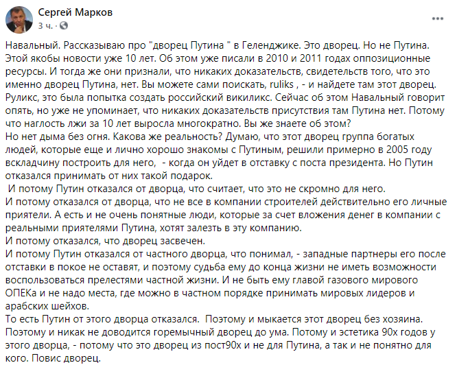 То есть Путин от этого дворца отказался. Поэтому и мыкается этот дворец без хозяина. Поэтому и никак не доводится горемычный дворец до ума. Потому и эстетика 90-х годов у этого дворца, - потому что это дворец из пост-90-х и не для Путина, а так и не понятно для кого. Повис дворец", - пишет Марков у себя в Фейсбуке.