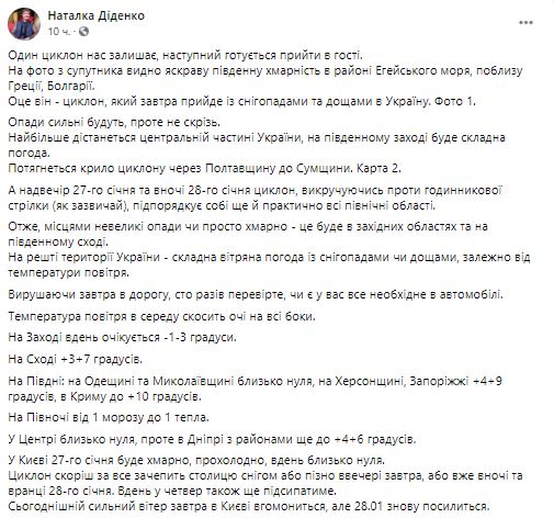 Как пишет синоптик Наталья Диденко, 27 января пройдут сильные осадки, но не везде. Больше всего достанется центральной части Украины, на юго-западе также будет сложная погода. Циклоном также накроет Полтавскую и Сумскую область. Вечером 27 января и ночью 28 января циклон охватит практически все северные области. В этих регионах ожидаются самые сильные осадки.
