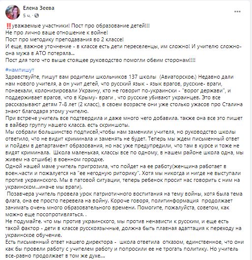 Автором поста стала Елена Зеева – депутат областного совета, которая среди прочих администрирует этот паблик. Она опубликована текст сообщения с приметкой, что пост – о методике преподавания во 2 классе и образовании детей, а не о личном отношении к войне.