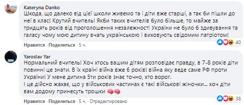 Одни пользователи пишут: "А на каком языке эта учительница говорила до 2014 года? Многие не поняли – тут не Россия враг, а враг – русскоговорящие украинцы! Да, надо переходить на украинский, но называть тех, кто говорит на русском языке, врагами – этим мнением пусть делится с родственниками на кухне, а не вбивает это в головы учеников!"