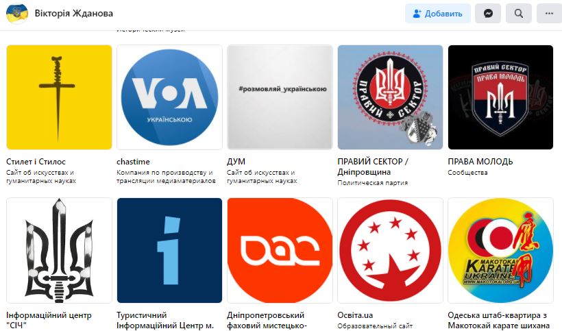 Что касается ее предпочтений, то среди страниц, которым она поставила отметку "нравится", есть много пабликов радикальных националистических организаций ("Правый сектор", "Права молодь", "Сiч", "Демократична сокира", "Рух опору капитуляции") и ветеранских движений.