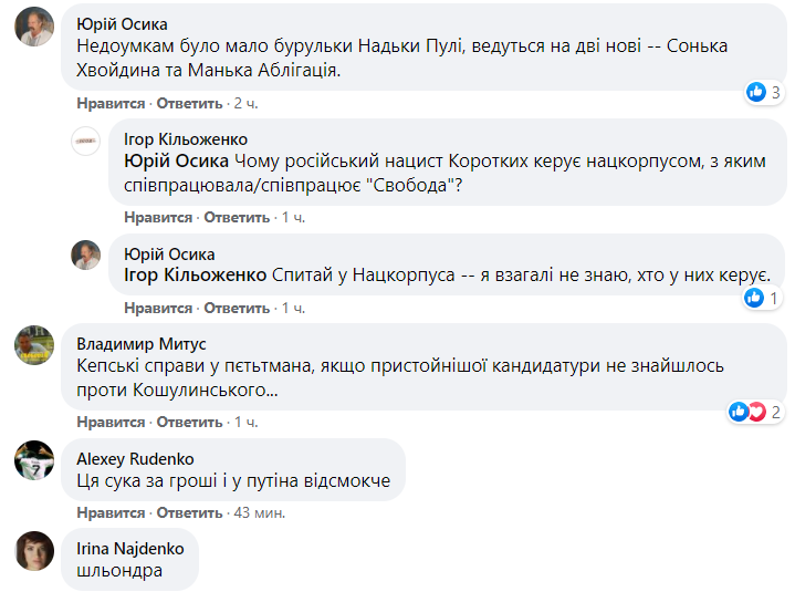 Комментарии сторонников Фарион соответствующие. Они критикуют Порошенко и говорят, что дела у него плохие, раз поставил против Кошулинского Зверобой.