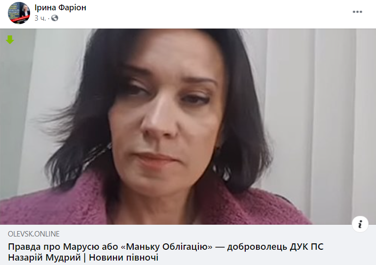 То есть Облигацию держали у себя Рошеновцы, чтобы она свидетельствовала о героизме их детей. Однажды Манька звонит нам в подразделение с требованием: "Столько-то средств, места в санаториях Закарпатья ..." На этом наше общение закончилось. Я воевал почти на всех горячих позициях, и нигде, никогда не видел спецназ Зверобой ... нигде и никогда", – пишет "друг Мудрый" в статье, которую разместила Фарион.