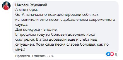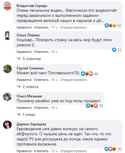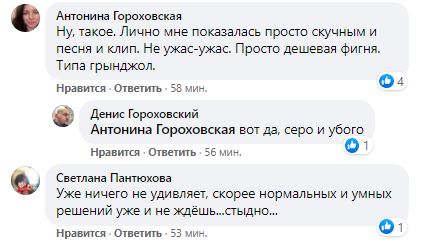 "На этом конкурсе давно уже чем придурастей, тем лучше. Ещё и победят!", "А можно не смотреть?", "Ну, такое. Лично мне показалась просто скучным и песня, и клип. Не ужас-ужас. Просто дешевая фигня. Типа грынджол", "Уже ничего не удивляет", - написали в комментариях к его посту другие пользователи.