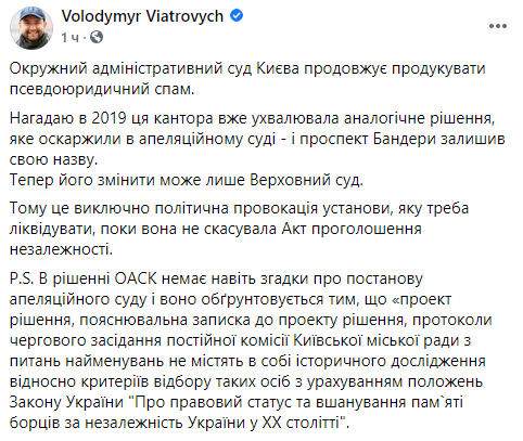 И теперь, по идее, на очереди отмена данного решения суда, которое снова запретило имя Бандеры в Киеве.