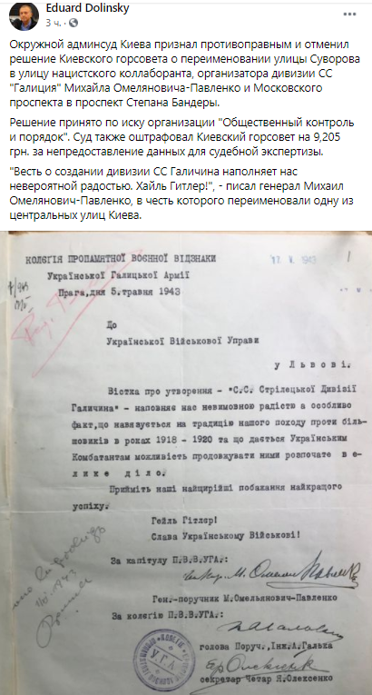 "Весть о создании дивизии СС Галичина наполняет нас невероятной радостью. Хайль Гитлер!", - писал генерал Михаил Омелянович-Павленко, в честь которого переименовали одну из центральных улиц Киева", - написал Долинский в Фейсбуке.